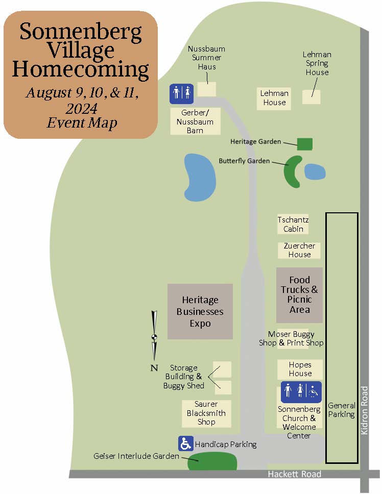 The event is located on the grounds of the Sonnenberg Village just outside of Kidron, OH. 13497 Hackett Rd, Applecreek, OH 44606. Sonnenberg Village Map